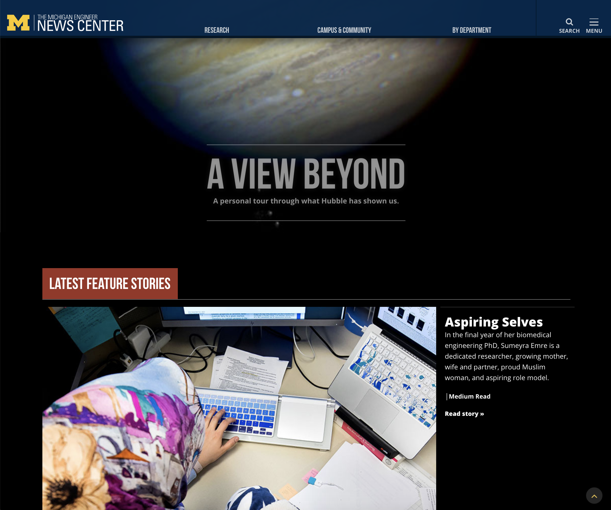 The redesigned news site for the College of Engineering at the University of Michigan (retired in 2021) showcases high-quality stories, videos and images in a way that is engaging and easy to navigate, reflecting the best practices of national and international news sites.