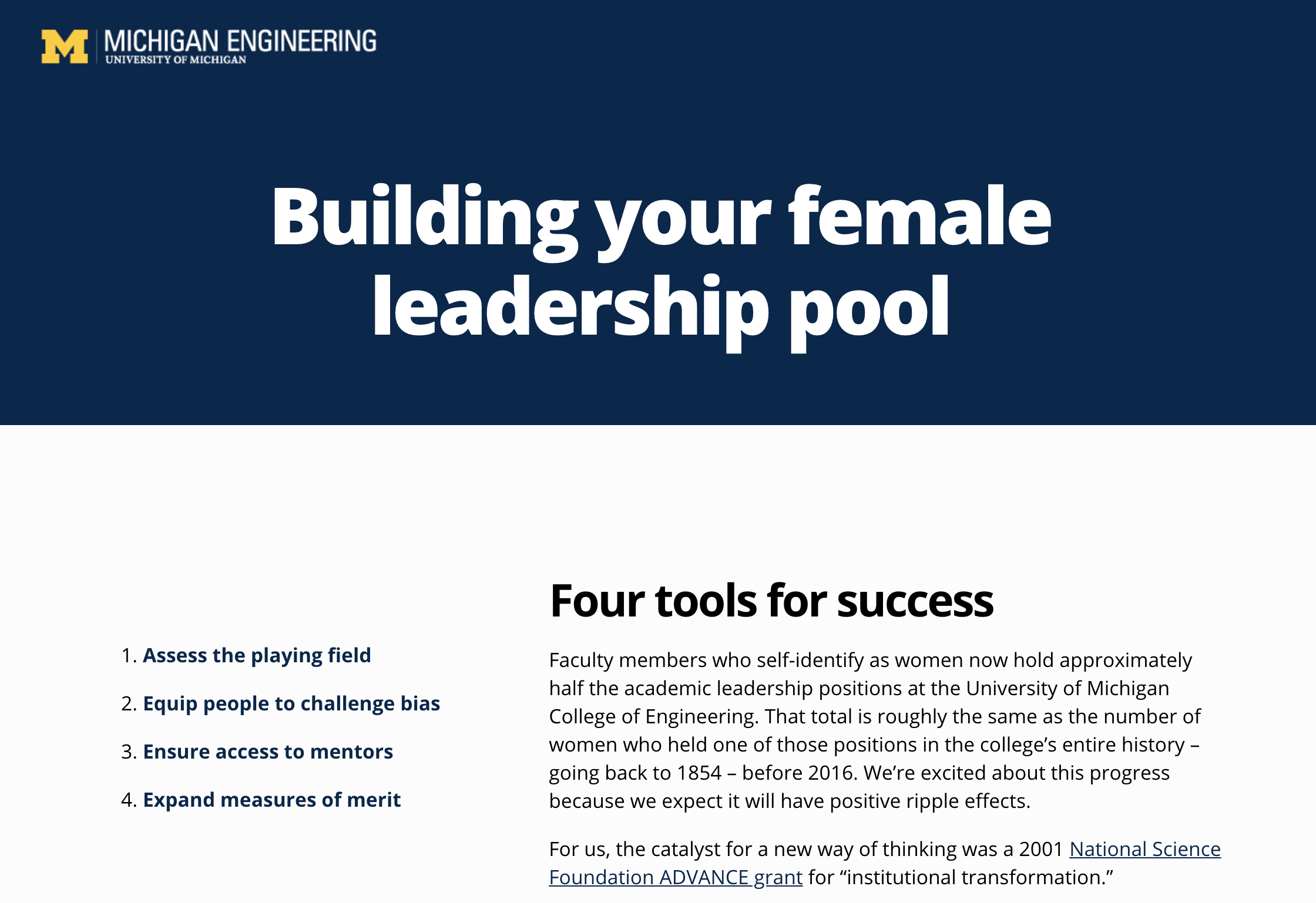 But more than that, we decided to dive deeper into how we achieved some critical milestones – such as achieving gender parity in our faculty leadership – to share those findings with others and lead change in the industry. Our writer Kate McAlpine spent months talking with leadership to learn the decades-long background, then expertly crafted that into a digestible narrative. We placed that narrative as an op-ed into the Chronicle of Higher Education, then followed that up with a webinar for the American Society of Engineering Education. Finally, we turned that content into a web product for continued use and marketing.